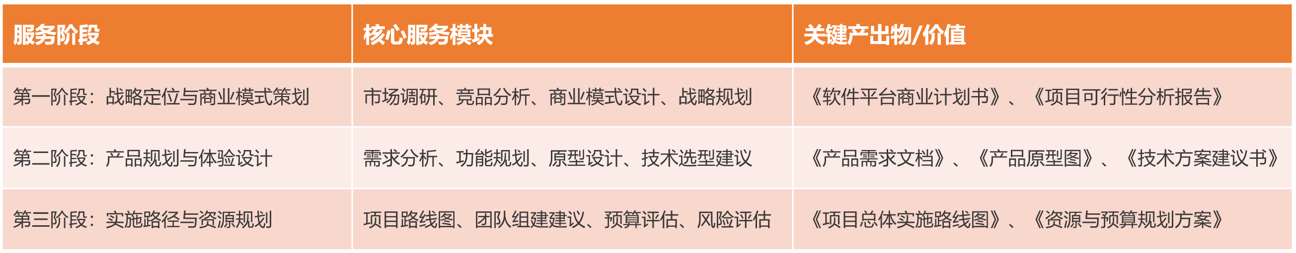 我们的服务植根于 “以先进技术赋能企业,以数字力量创造价值” 的企业使命,并始终秉持 “客户为先、专业匠心” 的价值观。我们致力于在项目启动前,通过科学的分析方法、丰富的实战经验与前瞻的行业洞察,帮助客户厘清目标、规划路径、规避风险,确保软件平台从诞生之初就走在正确的道路上,为后续的设计、开发与运营奠定坚实根基,最大化投资回报。